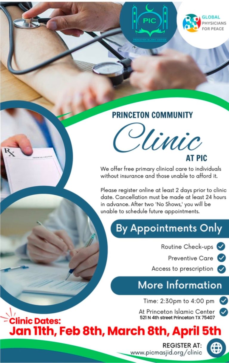 Our next Free Clinic at Princeton Islamic Center will be held on Dec 7. Clinic offers free primary care services for uninsured individuals, including routine check-ups, preventive medication, and prescription access