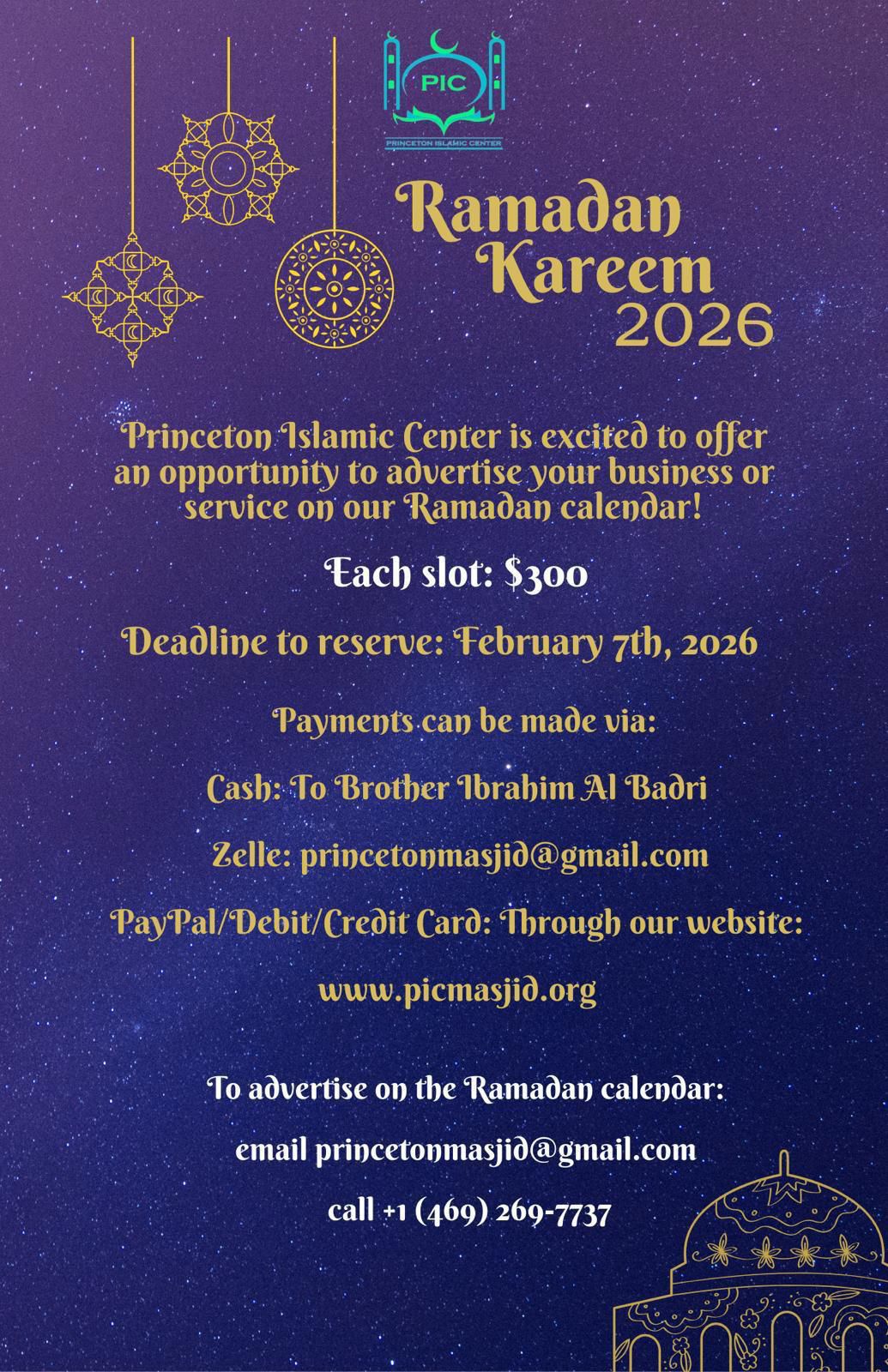 Princeton Islamic center is excited to offer an opportunity to advertise your business or service on our Ramadan Calendar. Each slot is for $300. To book a slot please contact us on the information provided.